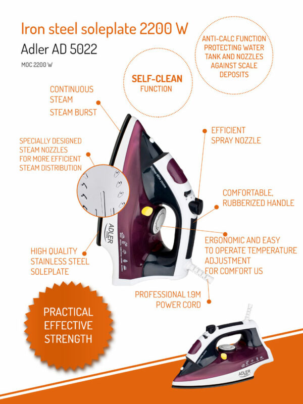 - Vrlo praktična pegla na paru snage 2200 W sa izdržljivom pločom od nehrđajućeg čelika.