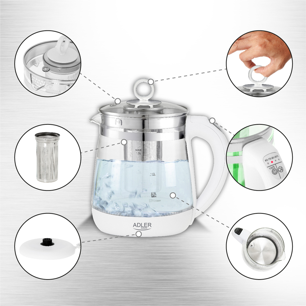 Adler Stakleni ketler 1.5L sa infuzerom za čaj i kontrolom temperature AD1299