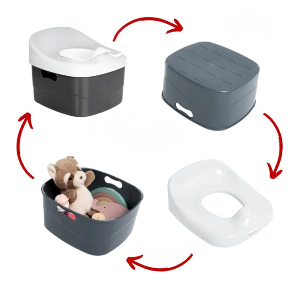 - Proizvod ima 4 funkcije: noša, adapter za WC šolju i steper, dok u kasnijem periodu detinjstva, proizvod služi kao toaletna kutija ili kutija za odlaganje igračaka.