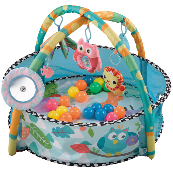 - U kompletu je i 30 loptica (6 plavih,6 zutih, 6 roze, 6 zelenih i 6 narandzatih) za igru kao i pet muzičkih zvečki u obliku zvezde,sove, ribice, lavića i papagaja i ogledalo u obliku cveta precnika 17cm.