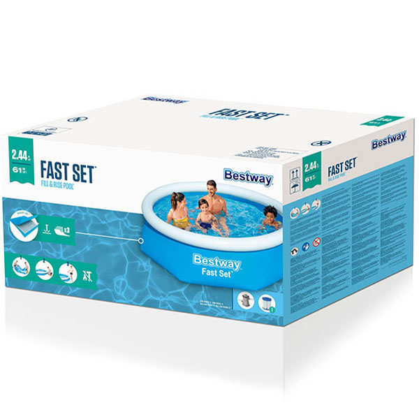- Bazen za decu sa prstenom na naduvavanje Fast set 244x61cm Bestway 57450 je bazen za brzo i jednostavno sklapanje – izaberite ravnu površinu, naduvajte prsten na naduvavanje, napunite bazen vodom i bazen je spreman za uživnaje!