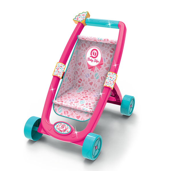 - Kolica za lutku u roze boji sa plavim točkovima i šarenim dezenom sa srcima.