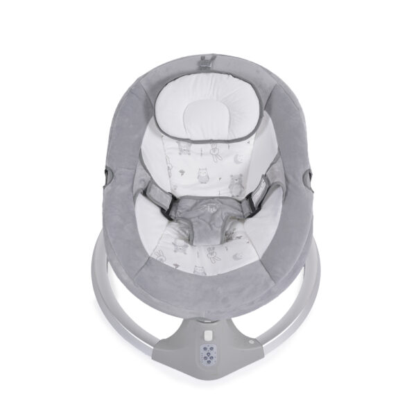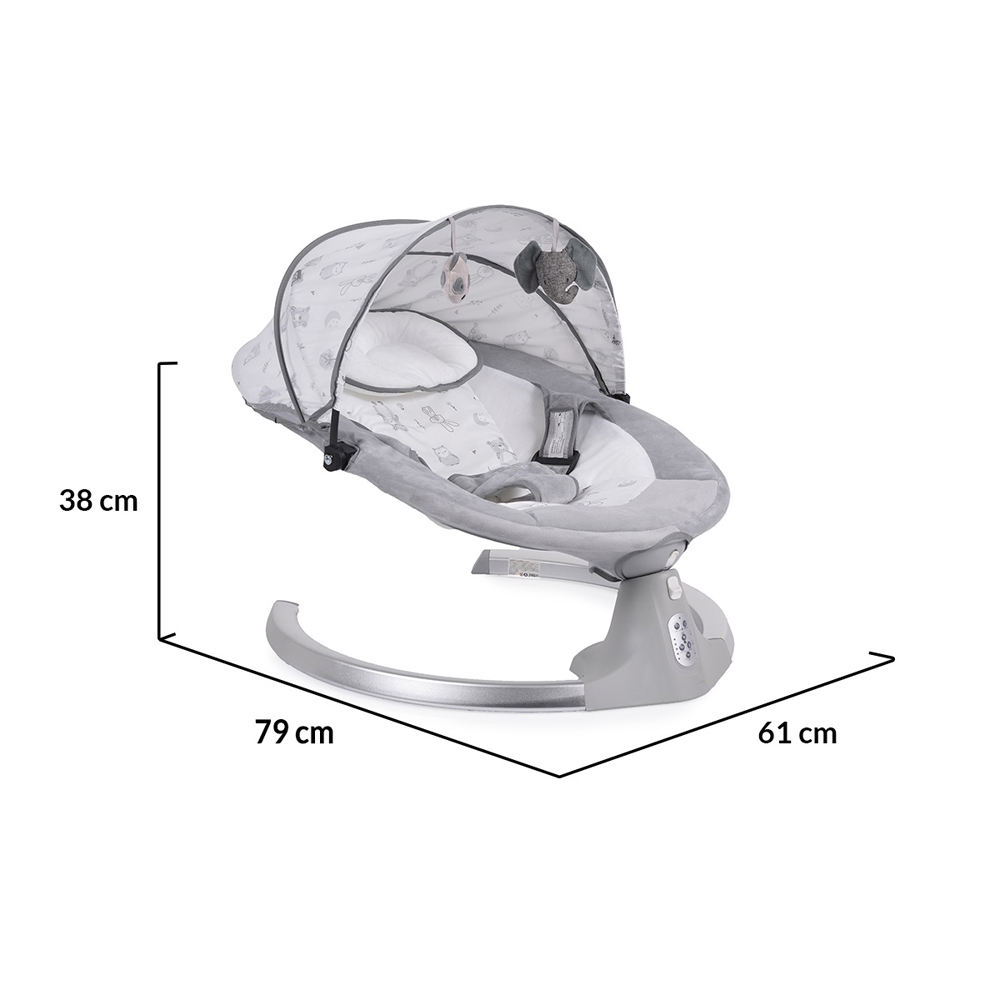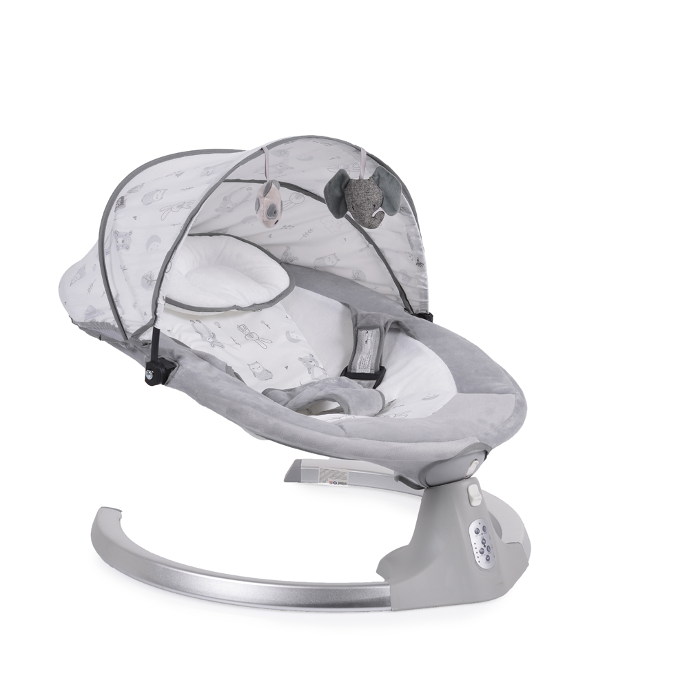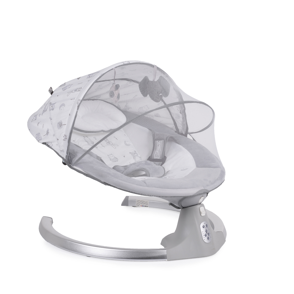 - Ima 5 brzina zamaha, tajmer sa 3 podešavanja, 12 divnih melodija, pojas sa 3 tačke, tenda sa mrežom protiv insekata sa 2 mekane igračke i funkcija „ležaljka“ pri zaključavanju mehanizma.