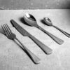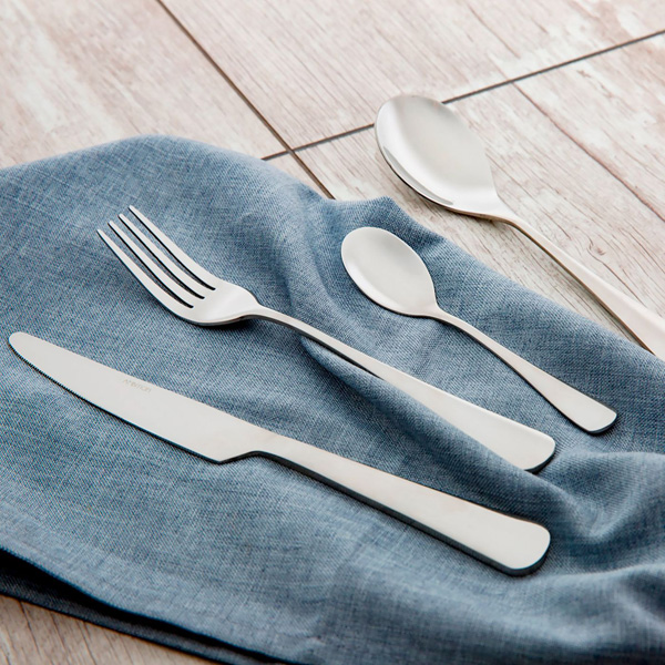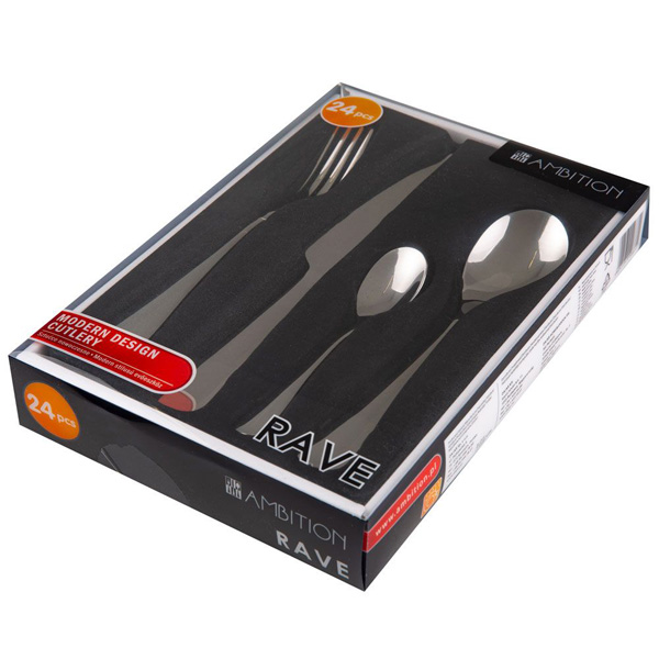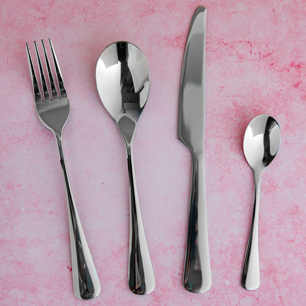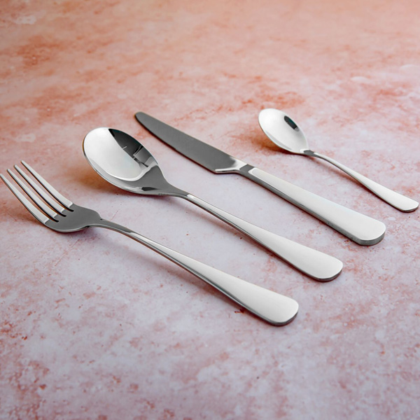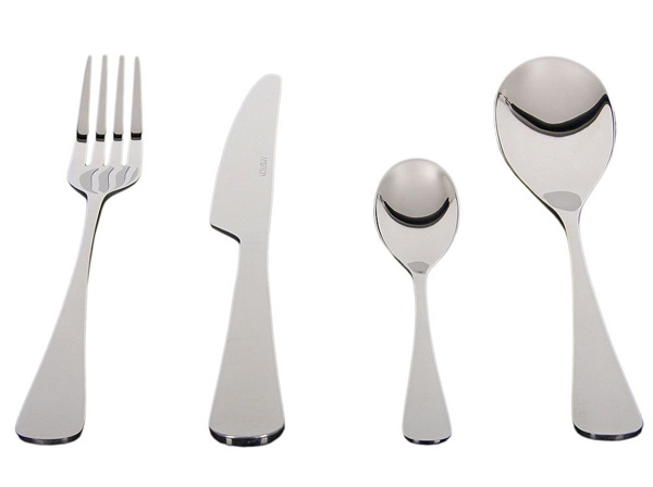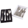 - Boja: srebrna. Sastoji se od: 6 kom noževa (23,5 cm), 6 kom viljuški (21 cm), 6 kom kašika (20 cm) i 6 kašika (14 cm)