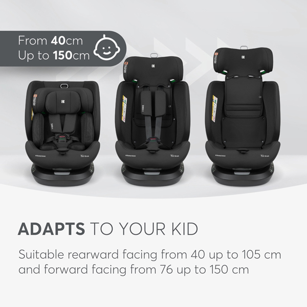 - Fleksibilna orijentacija – Pogodno za okrenuto unazad od 40 do 105 cm i okrenuto unapred od 76 do 150 cm, pokrivajući sve uzraste od novorođenčeta do približno 12 godina (0-36 kg).