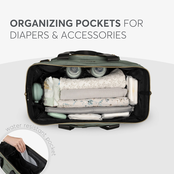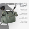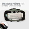 - Poseduje prostrani glavni džep sa širokim otvorom za lak pristup, specijalizovane pregrade za pelene i odeću i više spoljnih džepova, uključujući prednje i zadnje džepove sa patent zatvaračem i bočne džepove za brzi dohvat