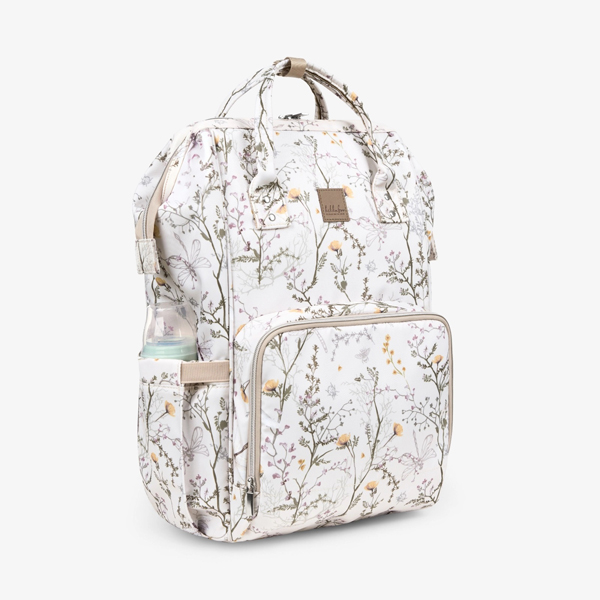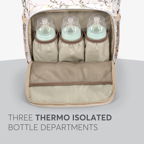 - Sadrži široki glavni džep sa metalnim okvirom za lak pristup, organizovane pregrade za pelene i pribor i vodootporni džep za mokre predmete