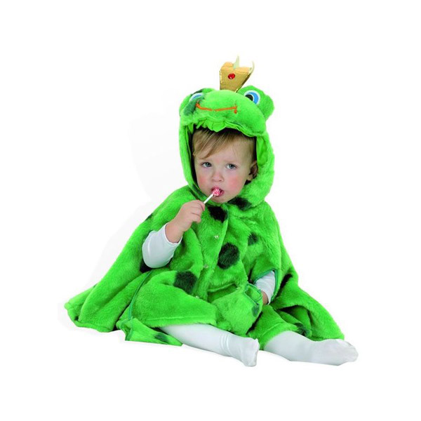- Sadrži ogrtač u zelenoj boji sa kapuljačom sa likom žabice, krunu i rukavice.