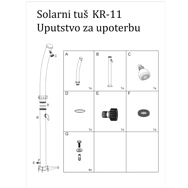 - Solarni tuš sa slavinom 20 L KR-11 namenjen za zagrevanje vode uz pomoć sunčeve svetlosti i korišćenje pre i nakon upotrebe bazena, pri čemu je zagrevanje vode ekloški i uz uštedu utroška električne energije.