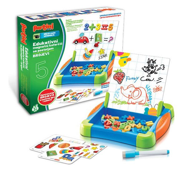 - Set sadrži tablu sa postoljem, 10 kartica sa brojevima, 10 magnetnih stikera, 20 magnetnih brojeva i specijani flomaster čiji se trag može brisati četkicom na vrhu njegovog poklopca