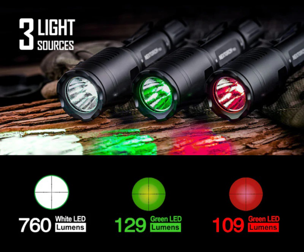 - Jačina: strobe / 760 lm(belo) / 129 lm(zeleno) / 109 lm(crveno) / 45 lm / momentary on / S.O.S.