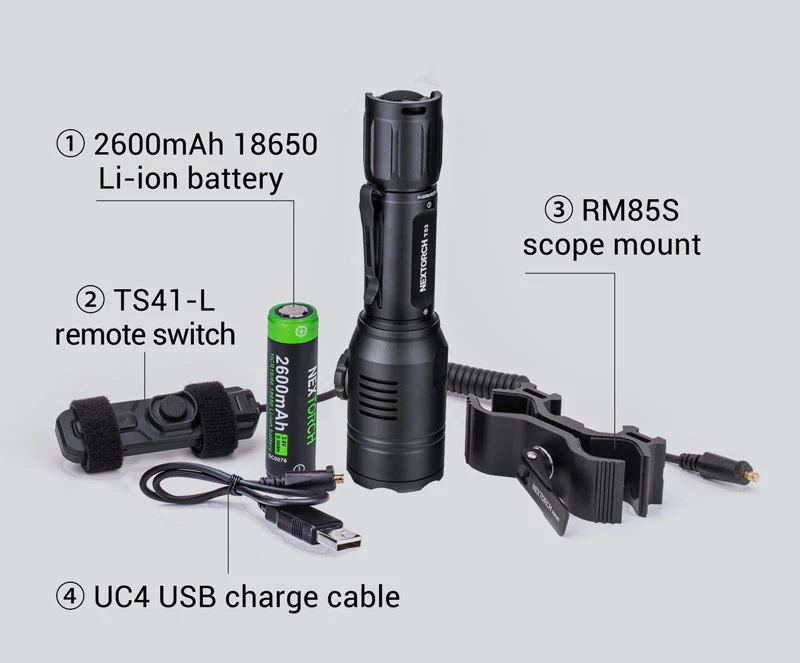 - Komplet sadrži: baterijsku lampu, RM85S držač za lampu, TS41-L miroprekidač, UC4 USB kabal za punjenje i 1 x 2600 mAh18650 Li-ion bateriju.