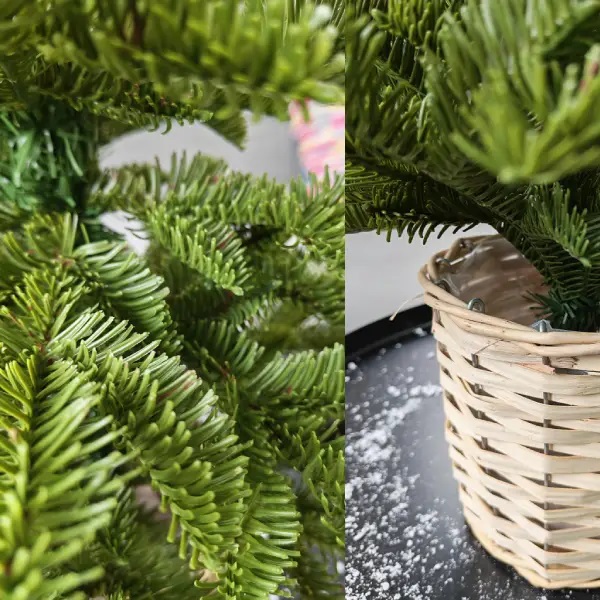 - Sa 107 PE grančica i prečnikom od 63 cm, novogodišnja jelka zelena 90 cm pruža pun i raskošan izgled, dok saksija od pruća dodaje rustičnu notu i čini je odmah spremnom za postavljanje bez dodatnih dekorativnih elemenata.