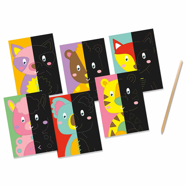 - Ovih šest zabavnih životinja još nije završeno. Hoćete li dovršiti crteže? Crne kartice za grebanje imaju smernice, tako da možete tačno da kopirate životinje. Sa drvenom olovkom za grebanje možete pratiti smernice i boju u oblastima. Takođe možete napraviti sopstvenu jedinstvenu kreaciju crtanjem različitih šablona.