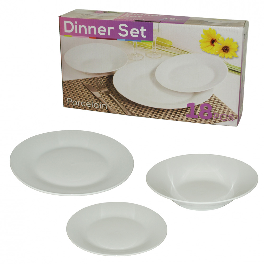 - Denis Home porculanski set od 18 tanjira: 6 plitkih (2,2 x 23 cm), 6 dubokih (4,1 x 20 cm), 6 desertnih (2,1 x 19 cm).