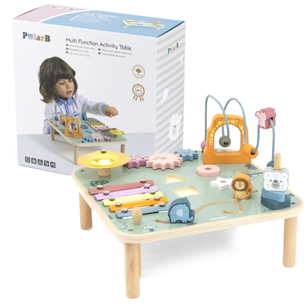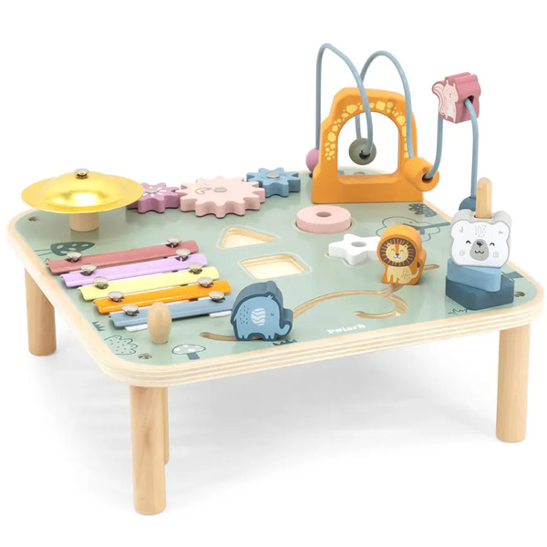 - Viga Polar B Aktiviti stočić je savršena igračka za bebe koja kombinuje zabavu i učenje opremljen različitim senzornim elementima: rolerkoster sa elementima valjkasnog i ktužnog oblika, zupčanike, ksilofon, drvenu udaraljku za ksilofon, gong, 4 otvora za umetaljke i mini lavirint sa 2 elementa u obliku lava i slona