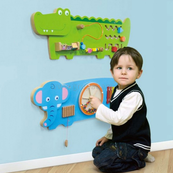 - Multifunkcionalna zidna igračka: uključuje ksilofon, muzički točak koji se vrti i drvenu udaraljku sa palicama koje su kanapom pričvršćene za pano