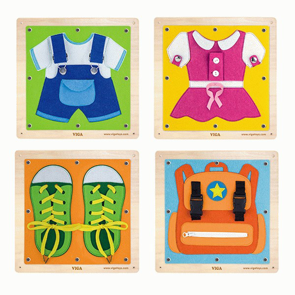 - Komplet sadrži 4 drvena rama dimezije 44x44x2,5cm na kojima se nalaze praktični zadaci za veštine oblacenja